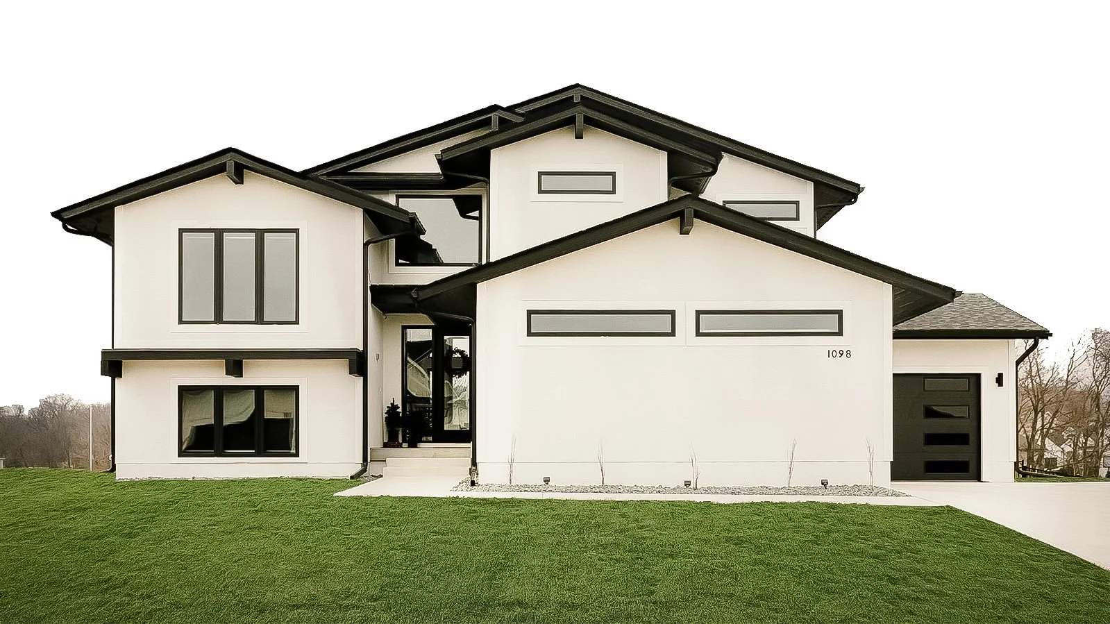 This contemporary residence combines rare wood grain textures with custom matte black cabinetry, crafted by a local Des Moines carpenter. The unique layout features a master suite 1/2 flight up and a top-floor catwalk connecting two bedrooms.